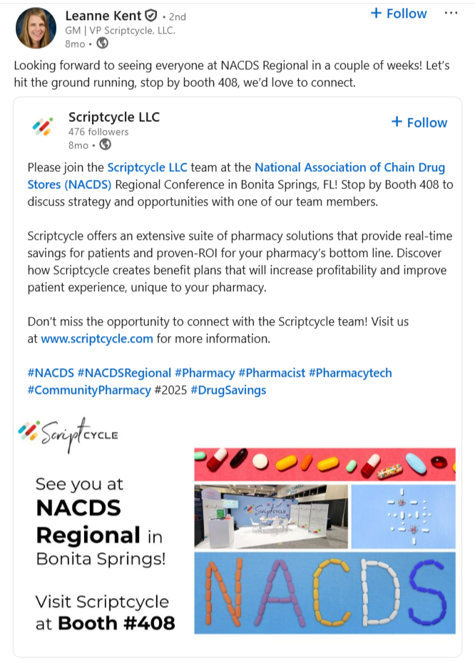 While you’re welcome to post across platforms, LinkedIn is where our industry connects most actively. It reflects the business focus of the NACDS Regional Chain Conference and is where attendees engage with peers, partners, and new ideas.
